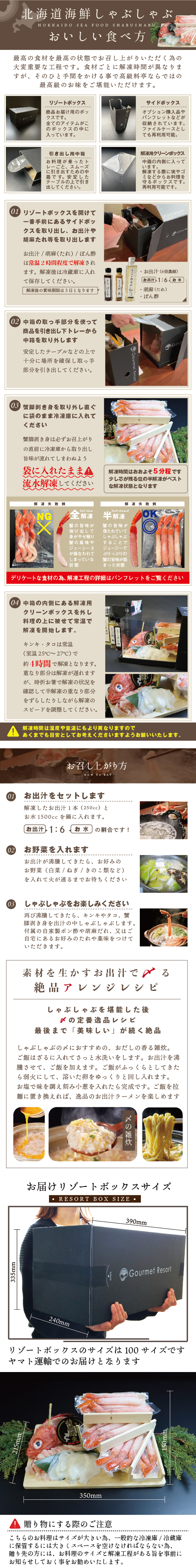 | 内 容 量 | キンキ尾頭付き刺身 / 北海道産生蛸/ 北海道産ずわい蟹脚/ 北海道産ずわい蟹爪 / 北海道産ブリ / 北海道産ほたて貝柱 / 北海道産黒毛和牛サーロイン / 北海道産上富良野地養豚 / しゃぶしゃぶ極み出汁 (3倍濃縮) /特製ポン酢 / 特製ゴマダレ | ||||||||||||||